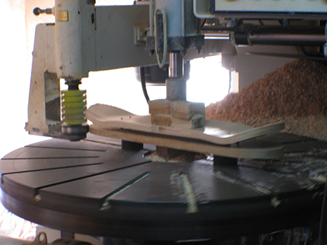 Left, Cutting out the blanks into the desired shape using an overhead router. Right, cutting decks out using a circular router.