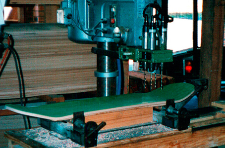 The coated veneers are laid up in the correct sequence, the stack (approx. 4 decks) is then placed into a hydraulic press with the particular concave moulds in between. As the veneers are pressed together, they slip against each other to form the concave and kicks etc, they are then left to harden and when pulled out they retain that form. I am constantly asked if they are steamed, NO they are not. The pressure at which they are pressed is the last major factor in the quality of a skateboard.