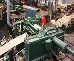 The next process is to turn a tree, or now log, into veneer ready to be pressed up into a skateboard. There are two basic and common ways that a log is turned into veneer. Slicing and rotary peeling.