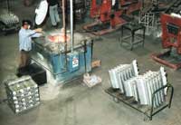 The patterns are then lifted out and the two halves are clamped together. The 356 Aluminum is heated up to temperatures of about 1200F, a gas is pumped through to get rid of bubbles. The molten metal is poured into holes in the top, the molten metal runs around "gates" connecting the hangers, or base plates together.