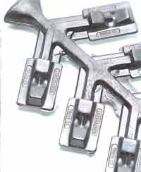 The patterns then have removable sides clamped around them and then a special mixture of clay/sand is compacted on top. This is done to each half of the patterns. For the hangers a sand rod is placed in where the axles are to go. These Rods are made of sand and resin. When the molten metal is poured in the resin burns off and sand is left. The axles are then hydraulically rammed into place later.