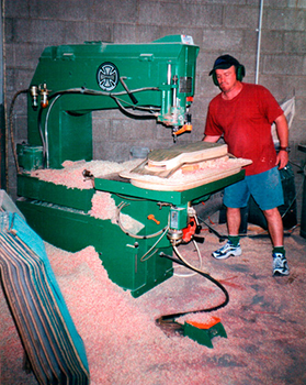 Many different machines are used for this process, some use computer operated machines that can cut out 4 decks at a time. Some use template type overhead routers as shown above, and still many others use a hand cut table router. I prefer to use the hand cut method, it is rather fast and the cuts are cleaner, usually without chatter. The shape templates are vacuumed down, and the blank and template are then run around a cutting blade with a bearing on it that runs around the template shape.