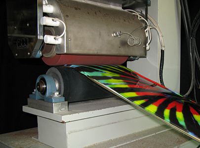 The "Heat Transfer" sheet is positioned onto the deck and then they are passed through a soft heated roller, the graphic sticks to the deck, the plastic film is peeled off, it is trimmed around, graphic done. The decks may be clear glossed after or usually left as is.