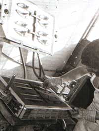 The patterns then have removable sides clamped around them and then a special mixture of clay/sand is compacted on top. This is done to each half of the patterns. For the hangers a sand rod is placed in where the axles are to go. These Rods are made of sand and resin. When the molten metal is poured in the resin burns off and sand is left. The axles are then hydraulically rammed into place later.